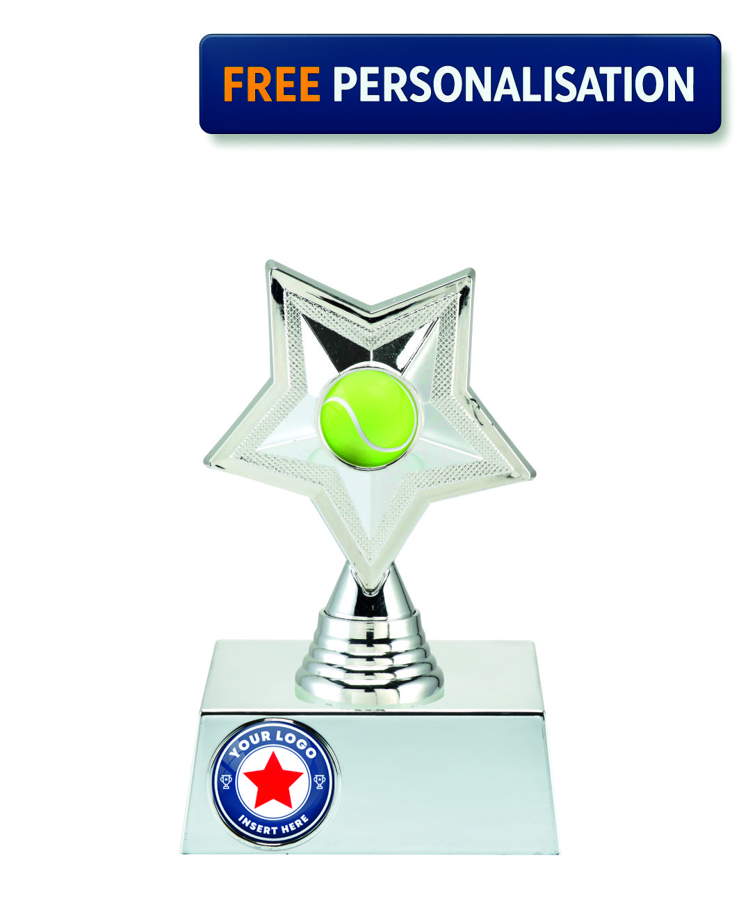 17.5cm SILVER STAR SHINE HOLDER TENNIS AWARD with domed resin. TENNIS logo, excellent quality award Packaged and delivered in 2-3 working days.