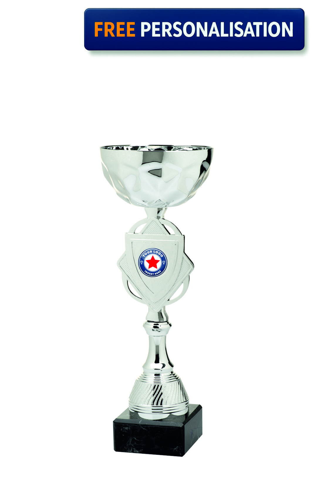 27cm Silver Shield Cup - ET.473.02.B. This elegant looking cup has a unique design and is perfect for presenting at any of your upcoming Presentations. Trophy comes complete with a fully personalised engraving plate and fast delivery straight to your door.