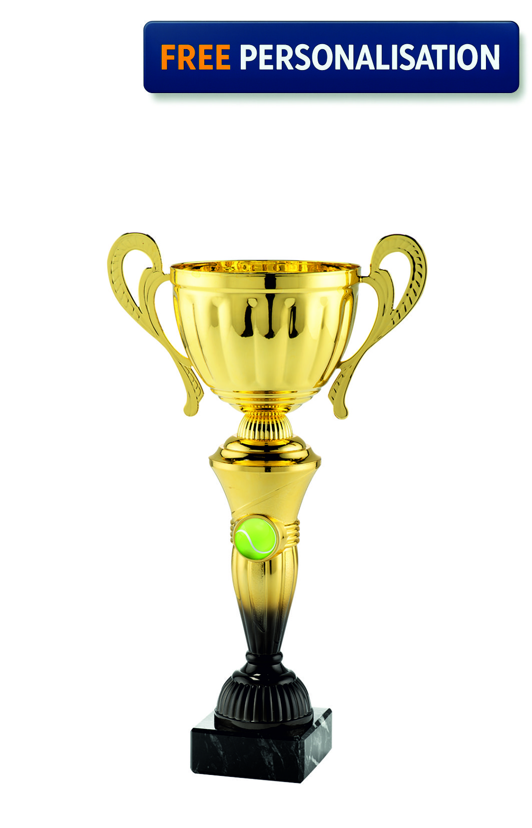 28cm GOLD & BLACK CUP TENNIS AWARD . TENNIS logo, excellent quality award Packaged and delivered in 2-3 working days.