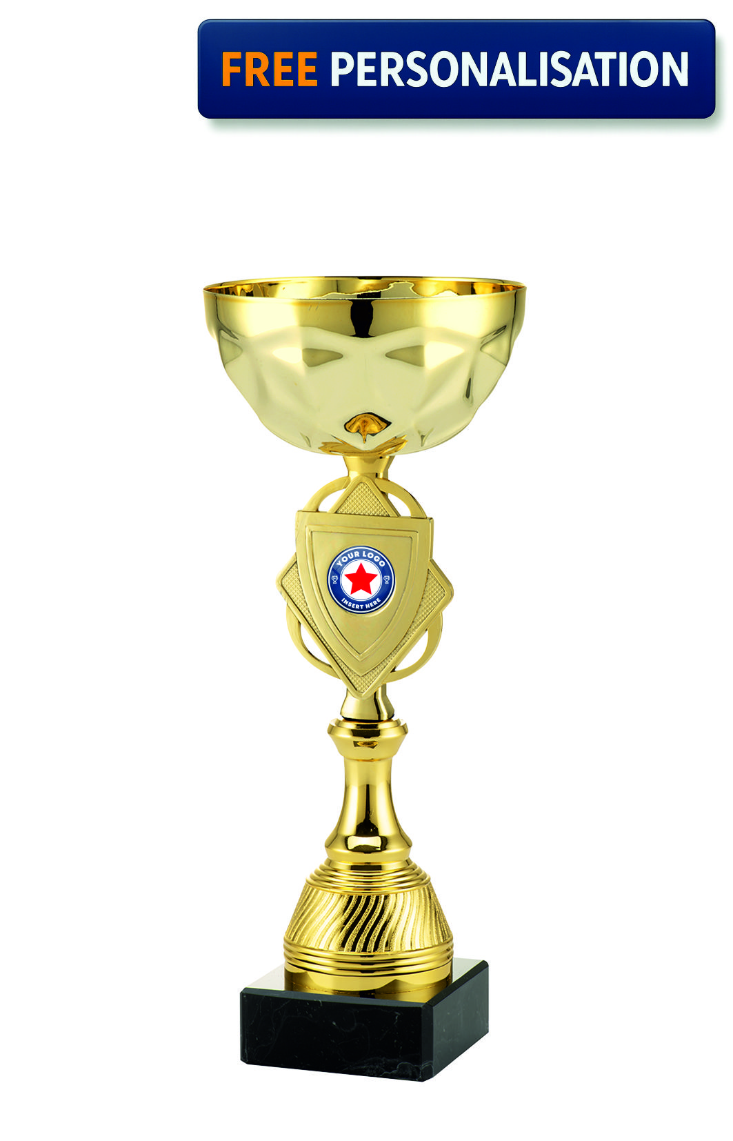 29.5cm Gold Shield Cup - ET.473.01.C. This elegant looking cup has a unique design and is perfect for presenting at any of your upcoming Presentations. Trophy comes complete with a fully personalised engraving plate and fast delivery straight to your door.