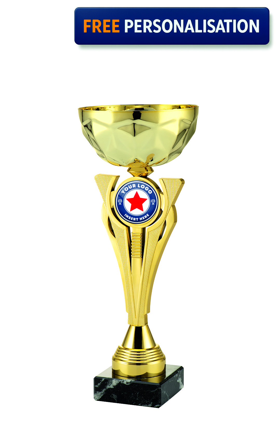 34cm Gold Geometric Cup - ET.481.01.C. This elegant looking cup has a unique design and is perfect for presenting at any of your upcoming Presentations. Trophy comes complete with a fully personalised engraving plate and fast delivery straight to your door.