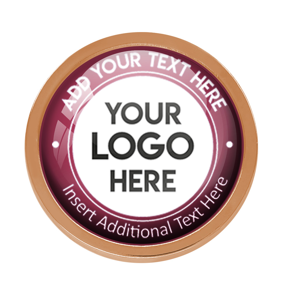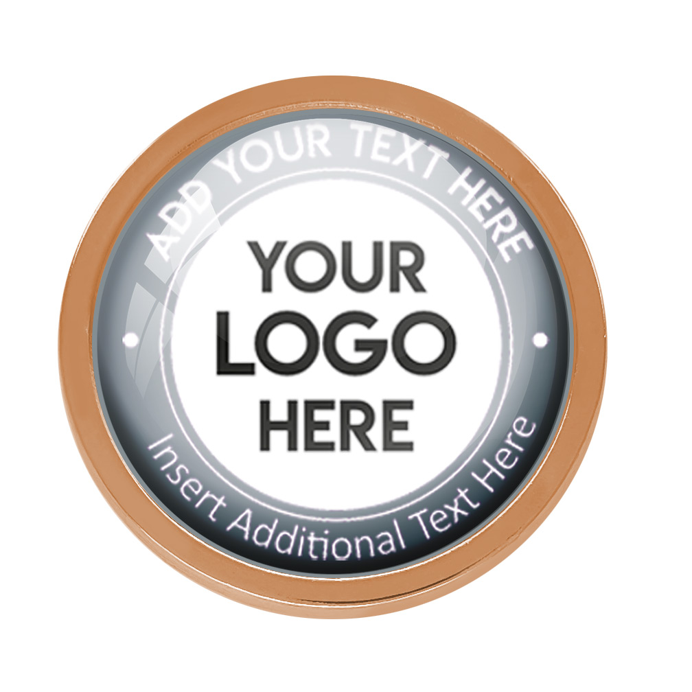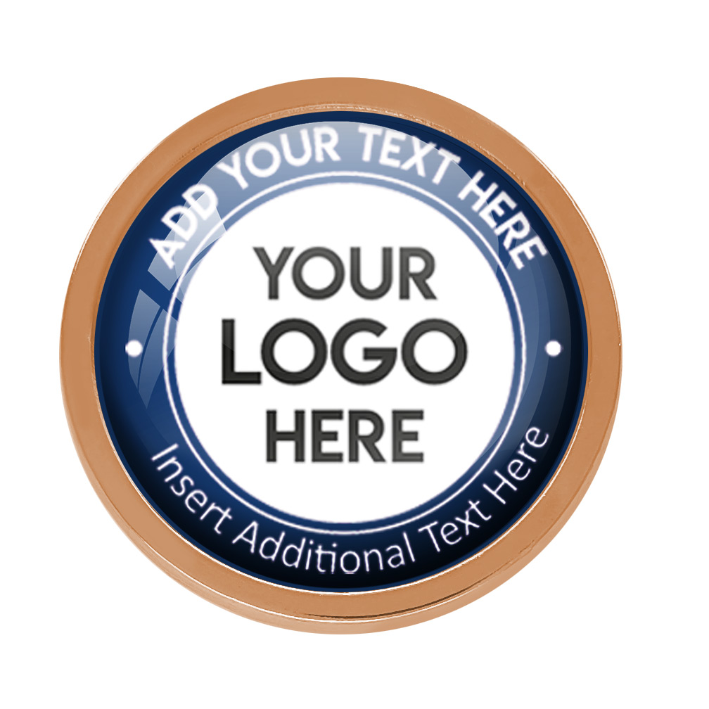 Bronze Bespoke Your Logo & Text Round Metal Badge (22mm). This stand alone, high quality bespoke metal round badge, has a metal gold casing with bespoke full colour domed insert. No origination cost and there is only a minimum order of 10 badges required. Comes with a domed resin finish. Butterfly Pin on reverse.