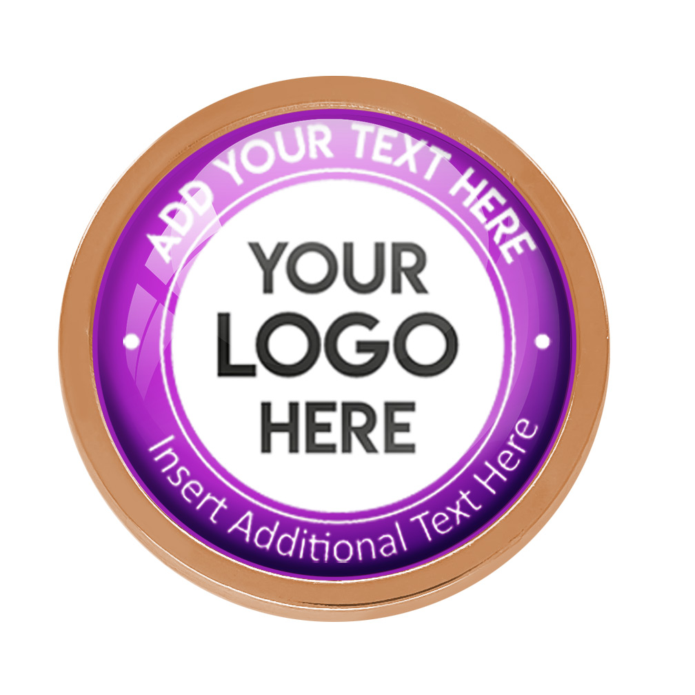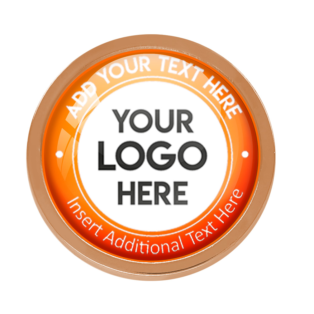 Bronze Bespoke Your Logo & Text Round Metal Badge (28mm). This stand alone, high quality bespoke metal round badge, has a metal gold casing with bespoke full colour domed insert. No origination cost and there is only a minimum order of 10 badges required. Comes with a domed resin finish. Butterfly Pin on reverse.