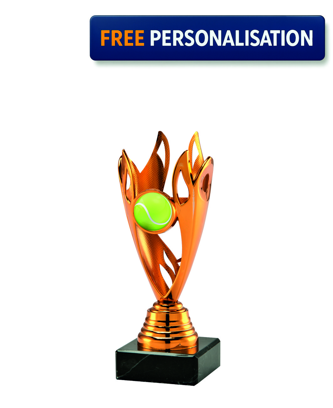 BRONZE FLAME SHINE HOLDER TENNIS AWARD with domed resin. TENNIS logo, excellent quality award Packaged and delivered in 2-3 working days.