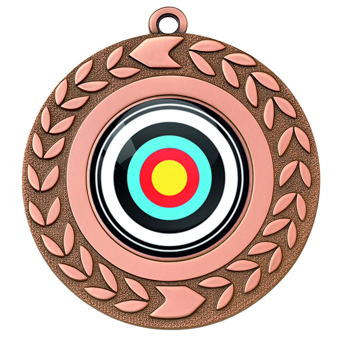 Bronze Wreath Colour Archery Medal - FREE Ribbon - BIE.M9460.03 - This 50mm Metal cast Medal includes a free Archery logo and free premium quality ribbon. Let archers remember your event by giving them a medal commemorating the occasion