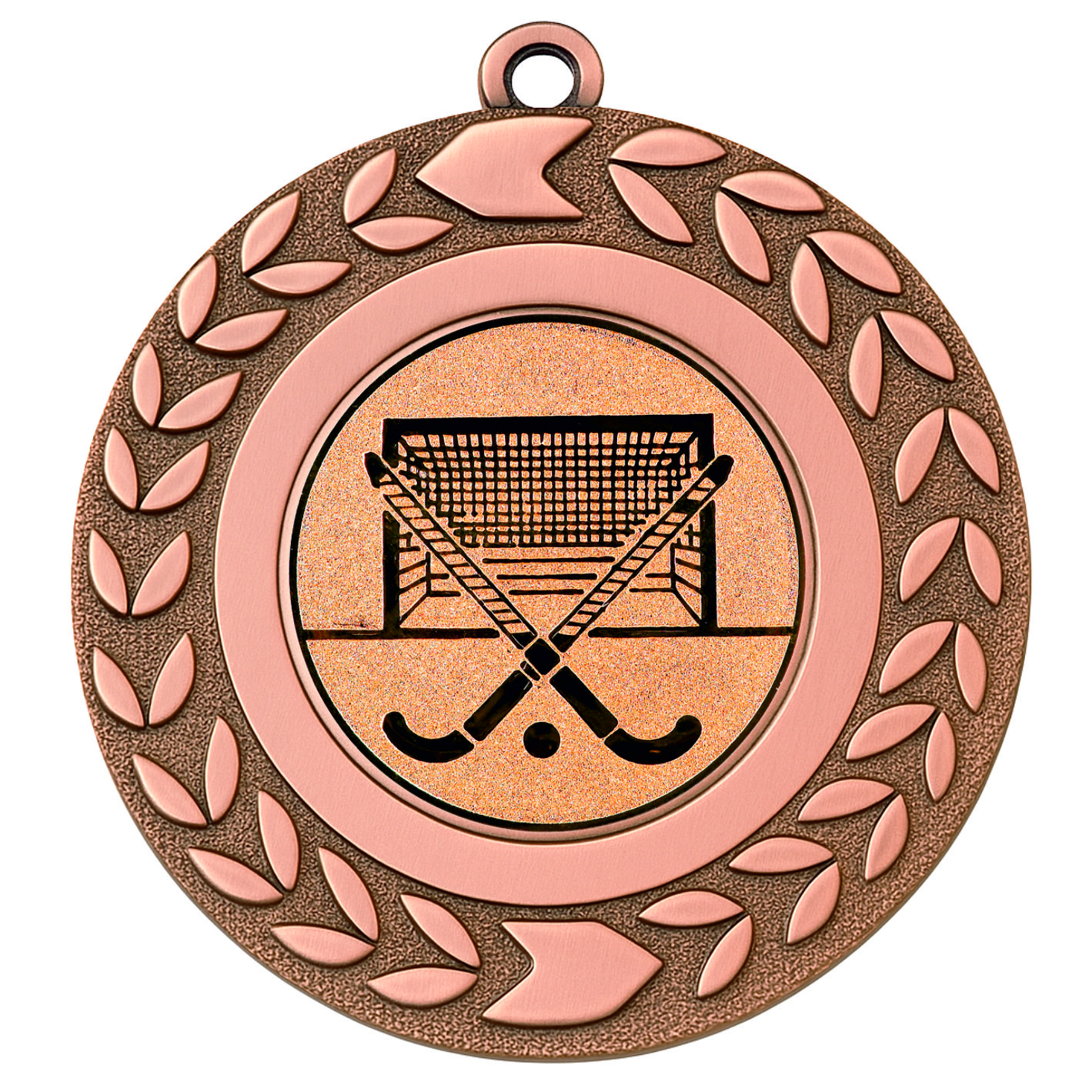 Bronze Wreath Hockey Medal - FREE Ribbon - BIE.M9460.03 - This 50mm Metal cast Medal includes a free Hockey logo and free premium quality ribbon.
