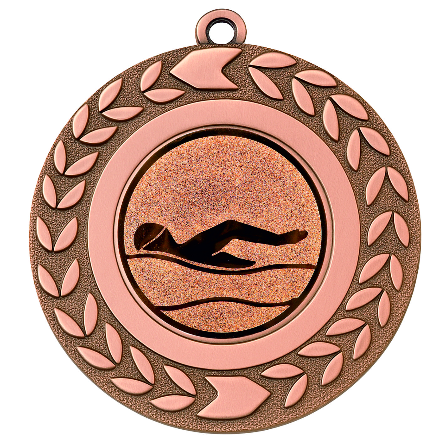 Bronze Wreath Swimming Medal - FREE Ribbon - BIE.M9460.03 - This 50mm Metal cast Medal includes a free Swimming logo and free premium quality ribbon.