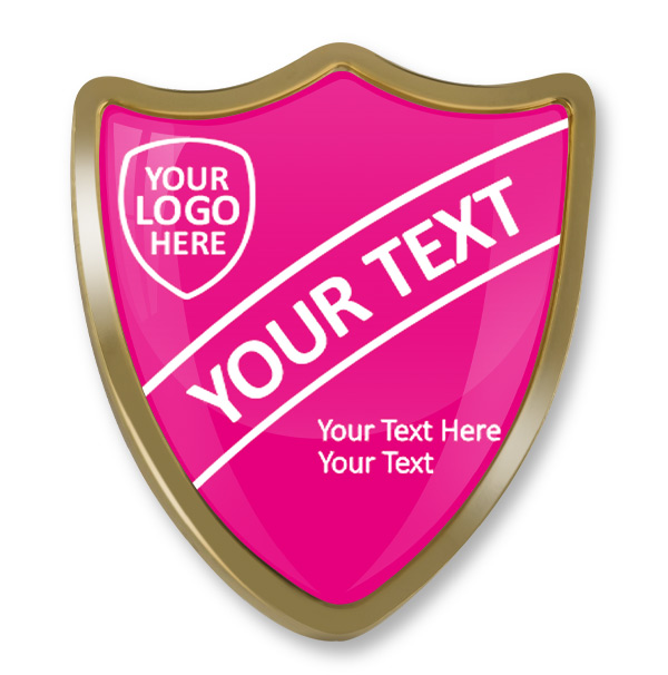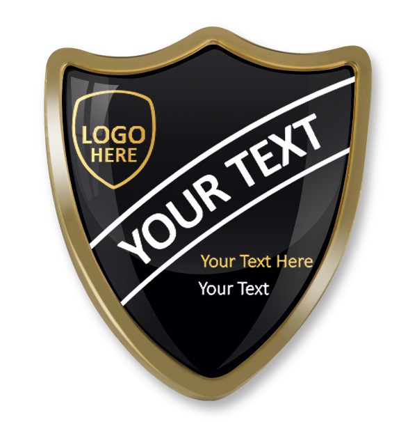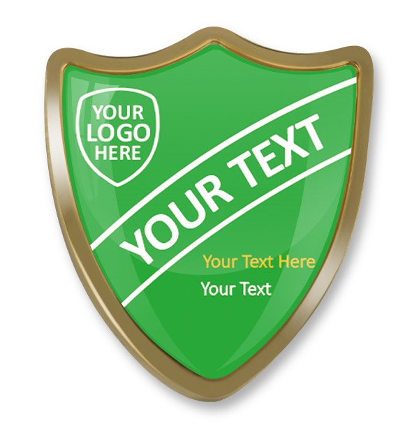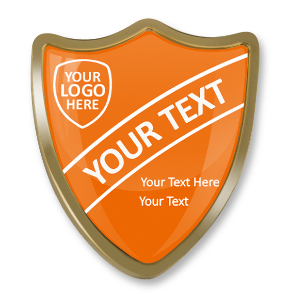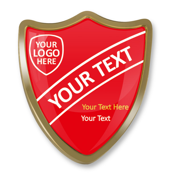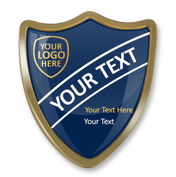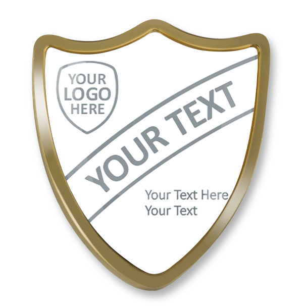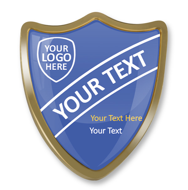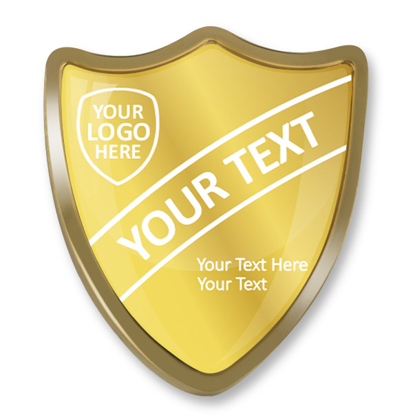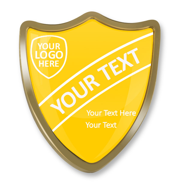 Gold Bespoke Shield Badge (35mm). Personalise your own school badge by choosing a background colour, adding your own text and your own logo. No origination cost and there is only a minimum order of 10 badges required. Your personalised design comes with a domed finish.
