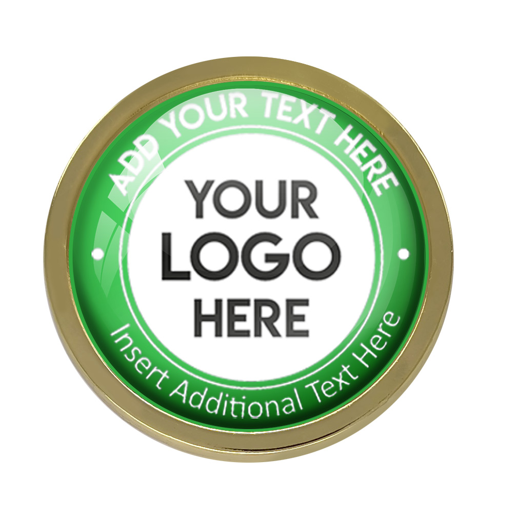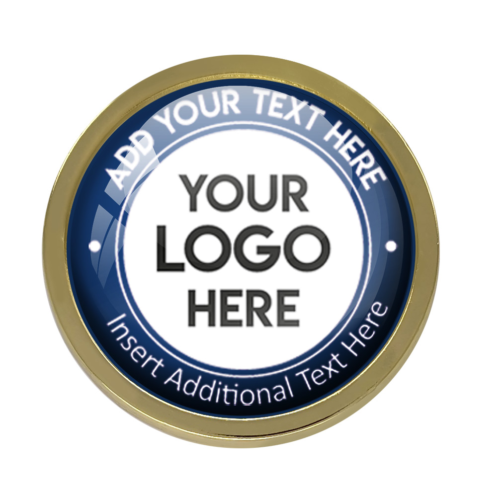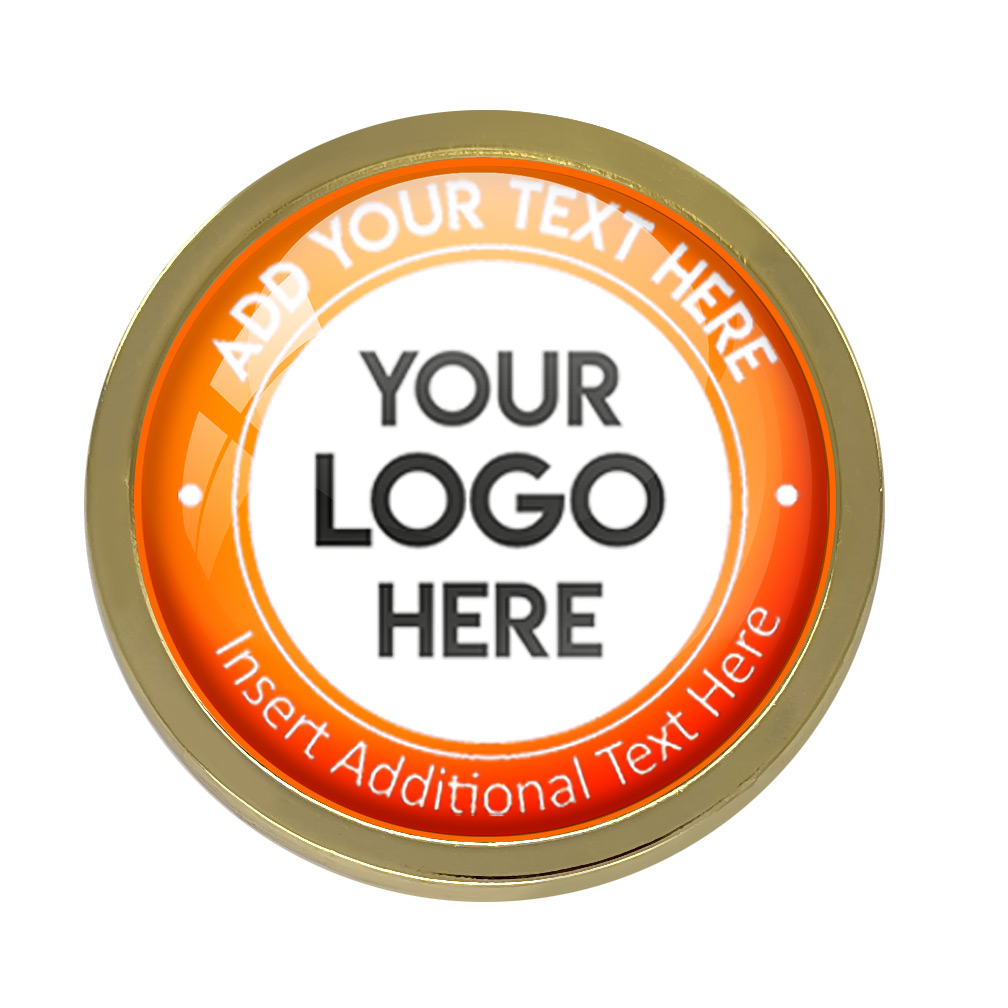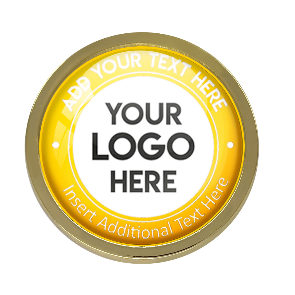 Gold Bespoke Your Logo & Text Round Metal Badge (22mm). This stand alone, high quality bespoke metal round badge, has a metal gold casing with bespoke full colour domed insert. No origination cost and there is only a minimum order of 10 badges required. Comes with a domed resin finish. Butterfly Pin on reverse.