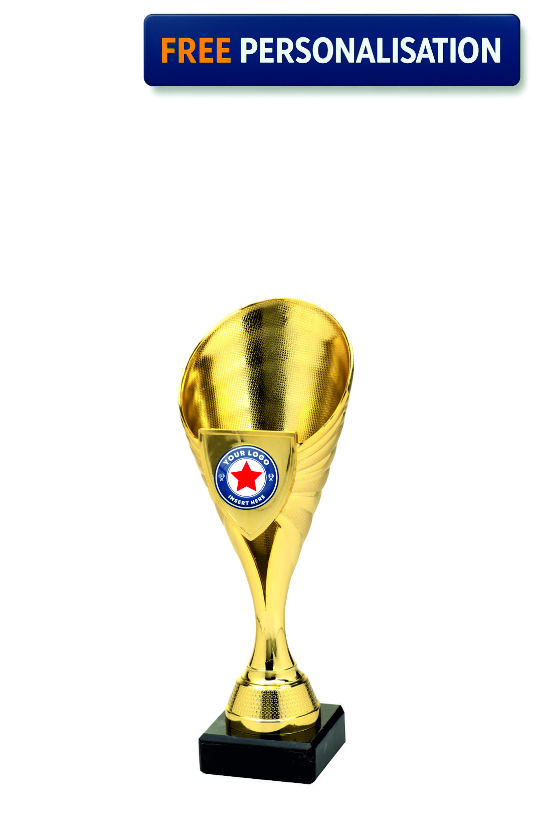 Gold Cone Cup - SET.357.01. This elegant looking cup has a unique design and is perfect for presenting at any of your upcoming Presentations. Trophy comes complete with a fully personalised engraving plate and fast delivery straight to your door.