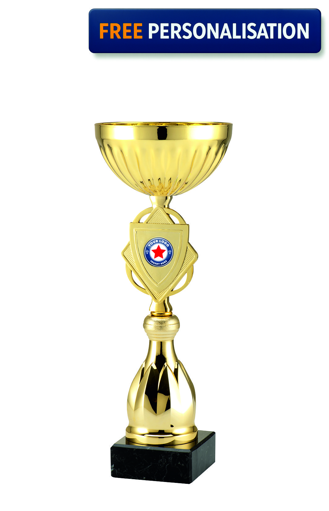 Gold Diamond Shield Cup- ET.511.01. This elegant looking cup has a unique design and is perfect for presenting at any of your upcoming Presentations. Trophy comes complete with a fully personalised engraving plate and fast delivery straight to your door.