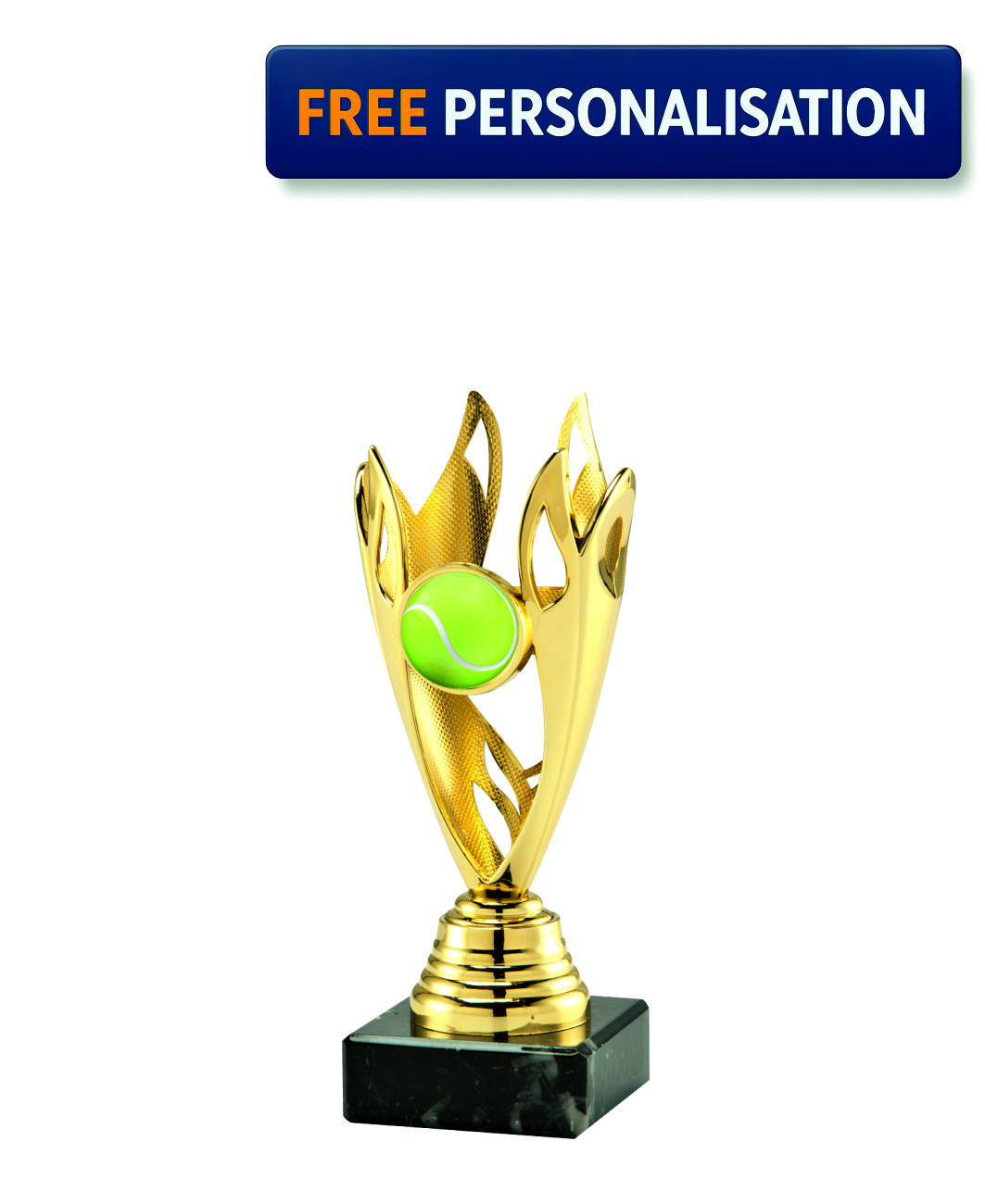 GOLD FLAME SHINE HOLDER TENNIS AWARD with domed resin. TENNIS logo, excellent quality award Packaged and delivered in 2-3 working days.