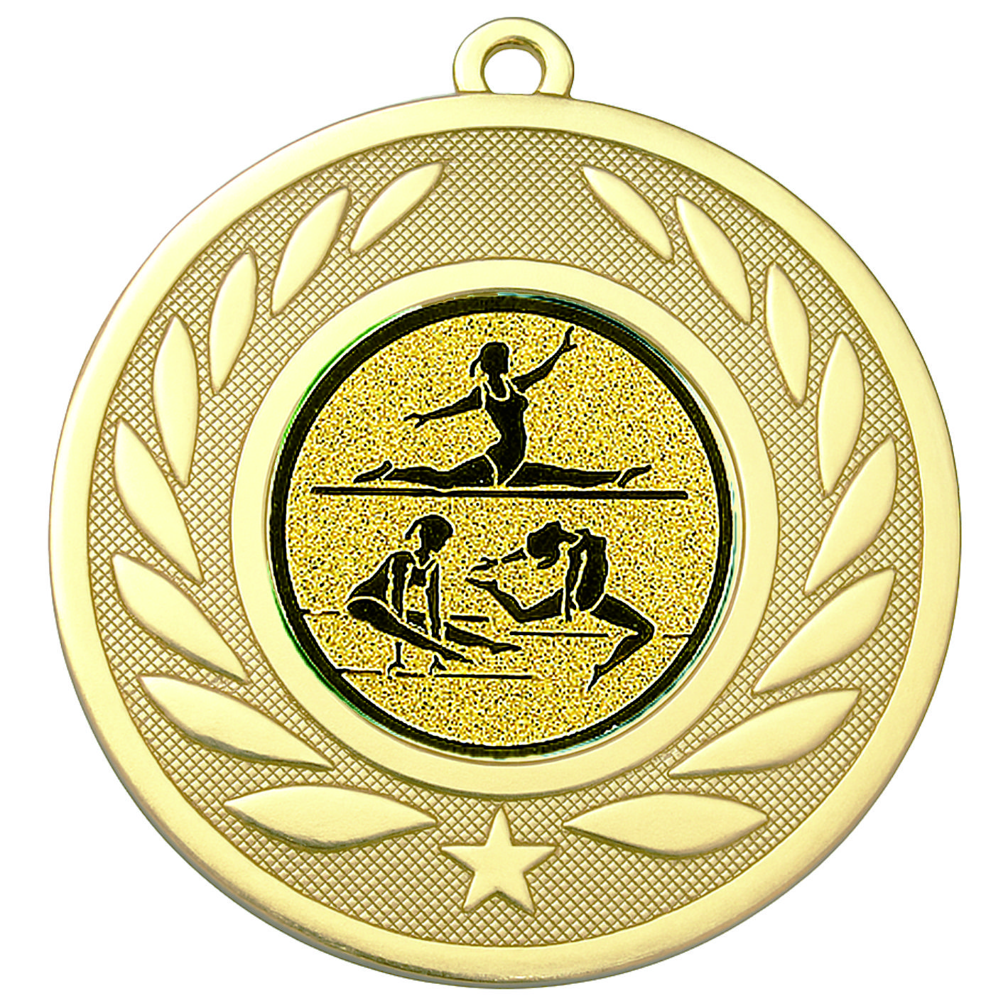Gold Laurel Female Gymnast Medal - FREE Ribbon - BIE.M9459.01 - This 50mm Metal cast Medal includes a free Female Gymnast logo and free premium quality ribbon.