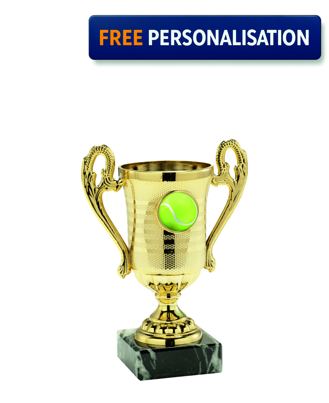 GOLD MINI CUP TENNIS AWARD with domed resin. TENNIS logo, excellent quality award Packaged and delivered in 2-3 working days.