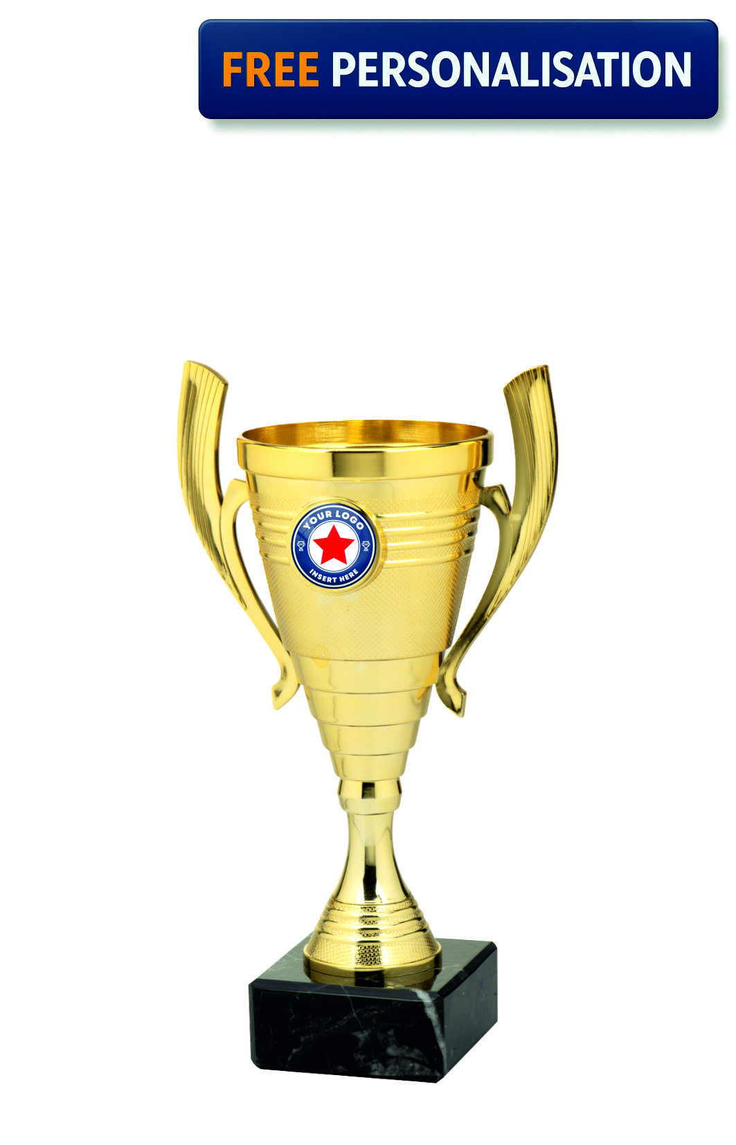 Gold Mini Cup with handles - SET.356.01.A. This elegant looking cup has a unique design and is perfect for presenting at any of your upcoming Presentations. Trophy comes complete with a fully personalised engraving plate and fast delivery straight to your door.
