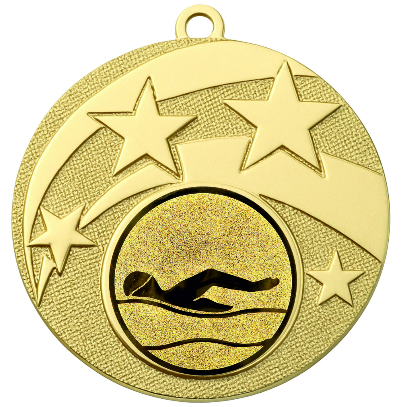 Gold Star Swimming Medal -FREE Ribbon -BIE.M9457.01 - This 50mm Metal cast Medal includes a free Swimming logo and free premium quality ribbon.