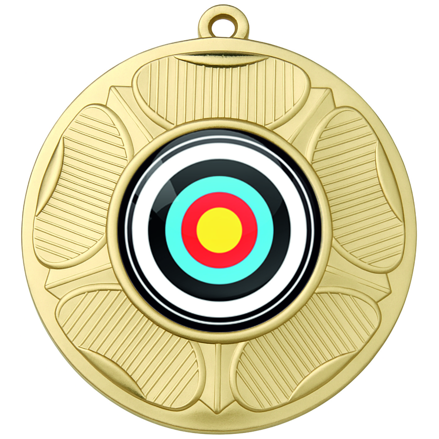 Gold Tudor Rose Colour Archery Medal - FREE Ribbon - BIE.M9458.01 - This 50mm Metal cast Medal includes a free Archery logo and free premium quality ribbon. Let archers remember your event by giving them a medal commemorating the occasion