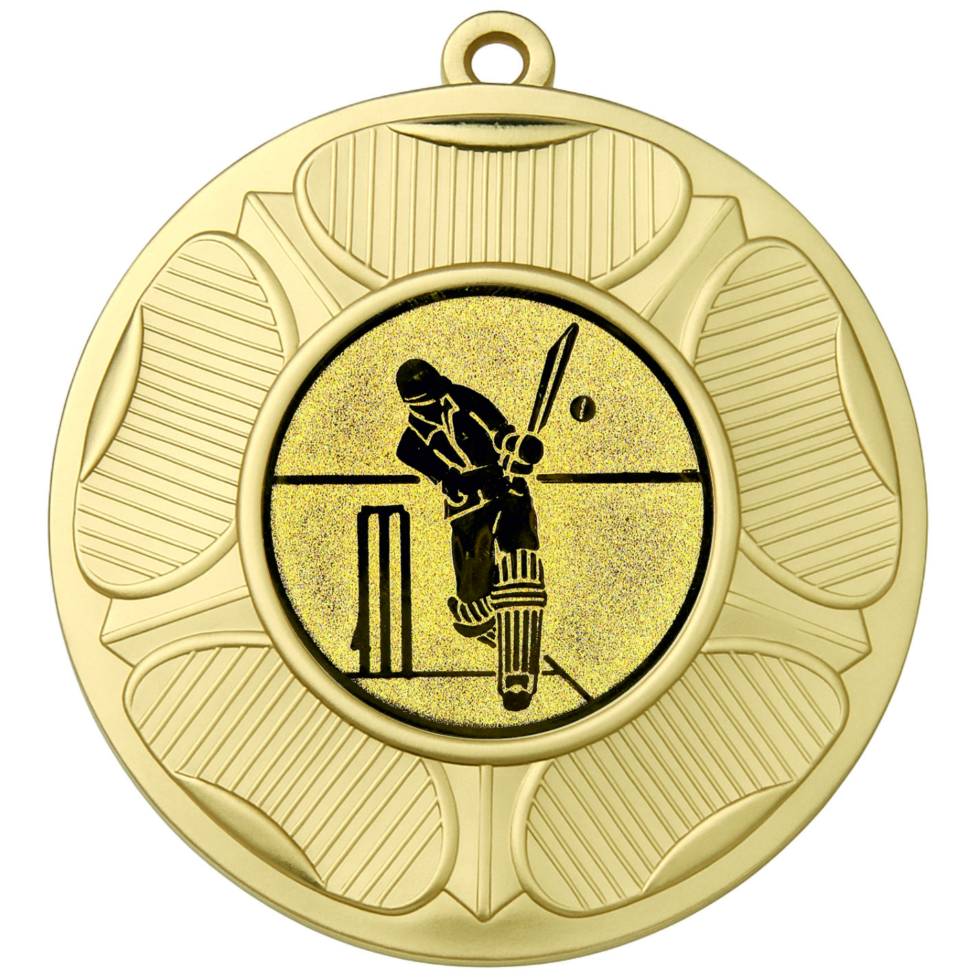 Gold Tudor Rose Cricket Medal-FREE Ribbon - BIE.M9458.01 - This 50mm Metal cast Medal includes a free Cricket logo and free premium quality ribbon.