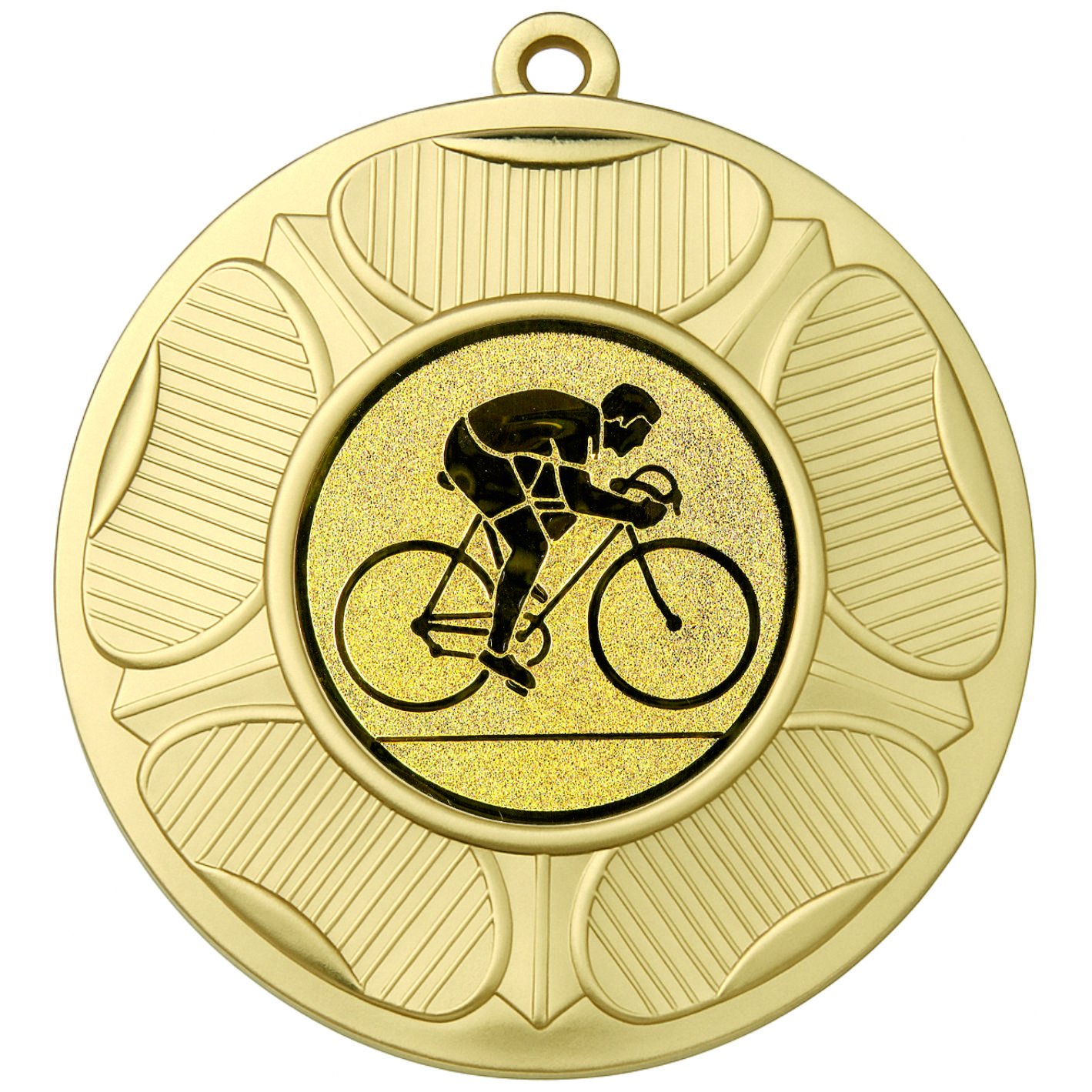 Gold Tudor Rose Cycling Medal-FREE Ribbon - BIE.M9458.01- This 50mm Metal cast Medal includes a free Cycling logo and free premium quality ribbon.