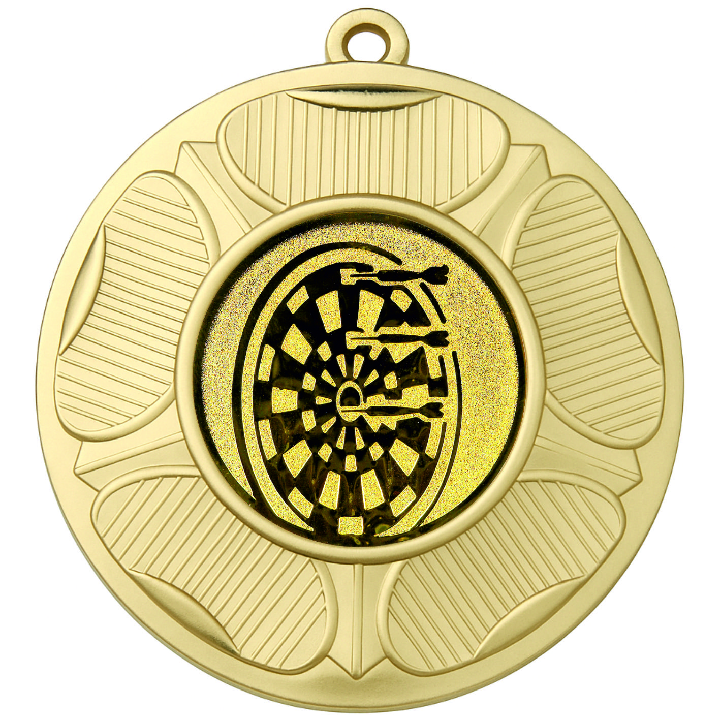 Gold Tudor Rose Darts Medal-FREE Ribbon - BIE.M9458.01- This 50mm Metal cast Medal includes a free Darts logo and free premium quality ribbon.