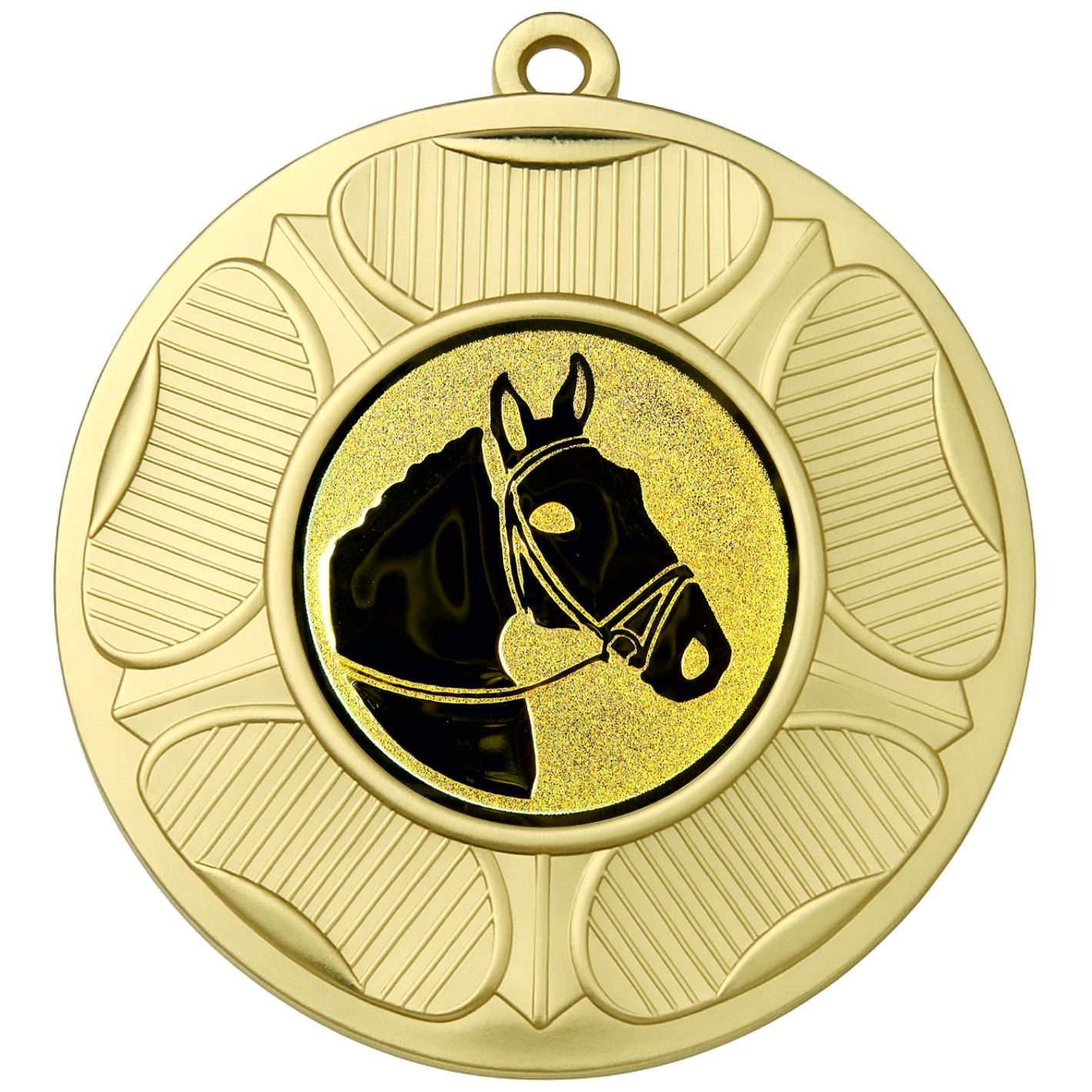 Gold Tudor Rose Horses Head Medal - FREE Ribbon - BIE.M9458.01 - This 50mm Metal cast Medal includes a free Horses Head logo and free premium quality ribbon.