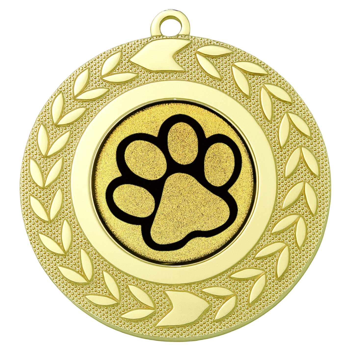 Gold Wreath Dog Paw Medal - FREE Ribbon - BIE.M9460.01 - This 50mm Metal cast Medal includes a free Dog Paw logo and free premium quality ribbon.