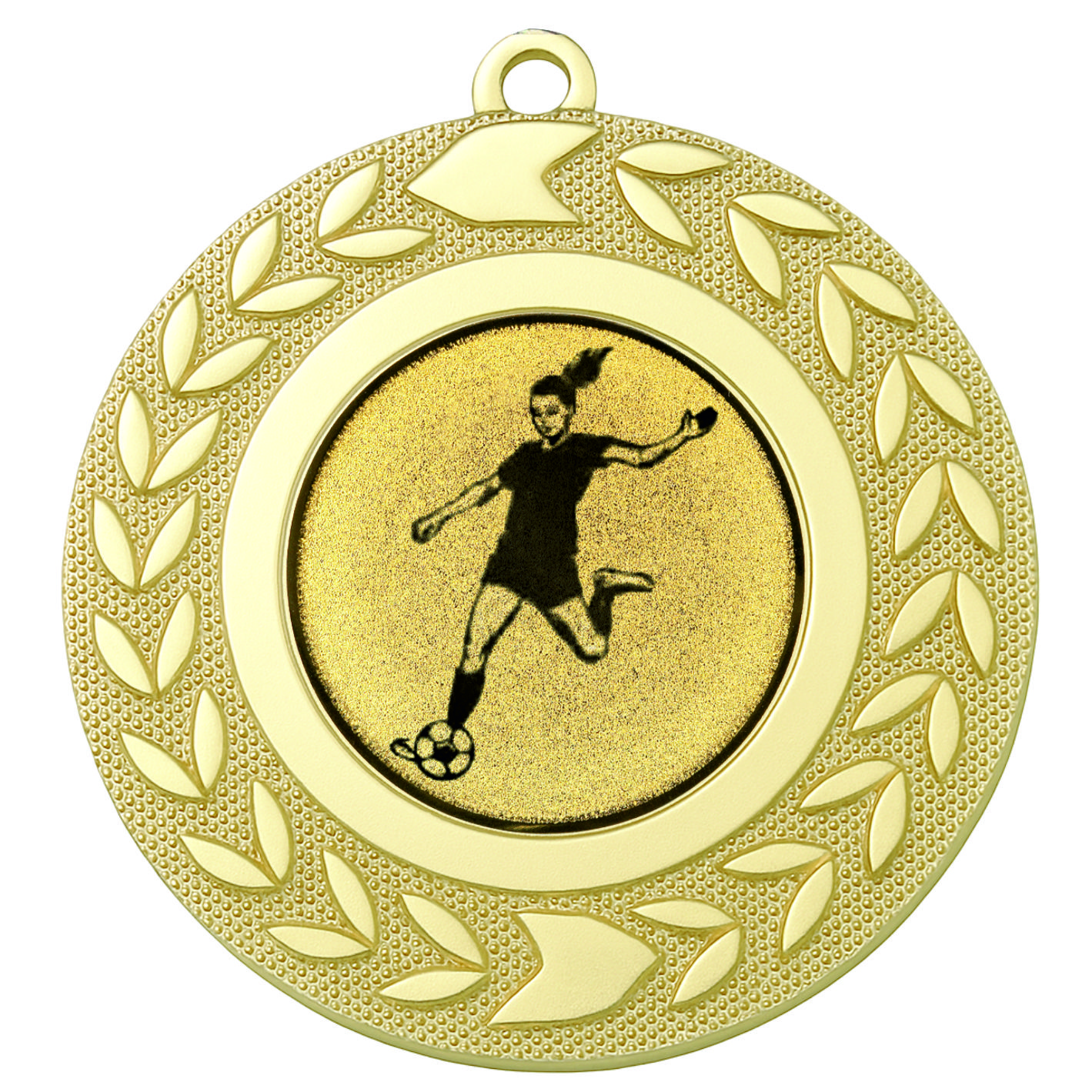 Gold Wreath Female Football Medal - FREE Ribbon - BIE.M9460.01 - This 50mm Metal cast Medal includes a free Female Football logo and free premium quality ribbon.