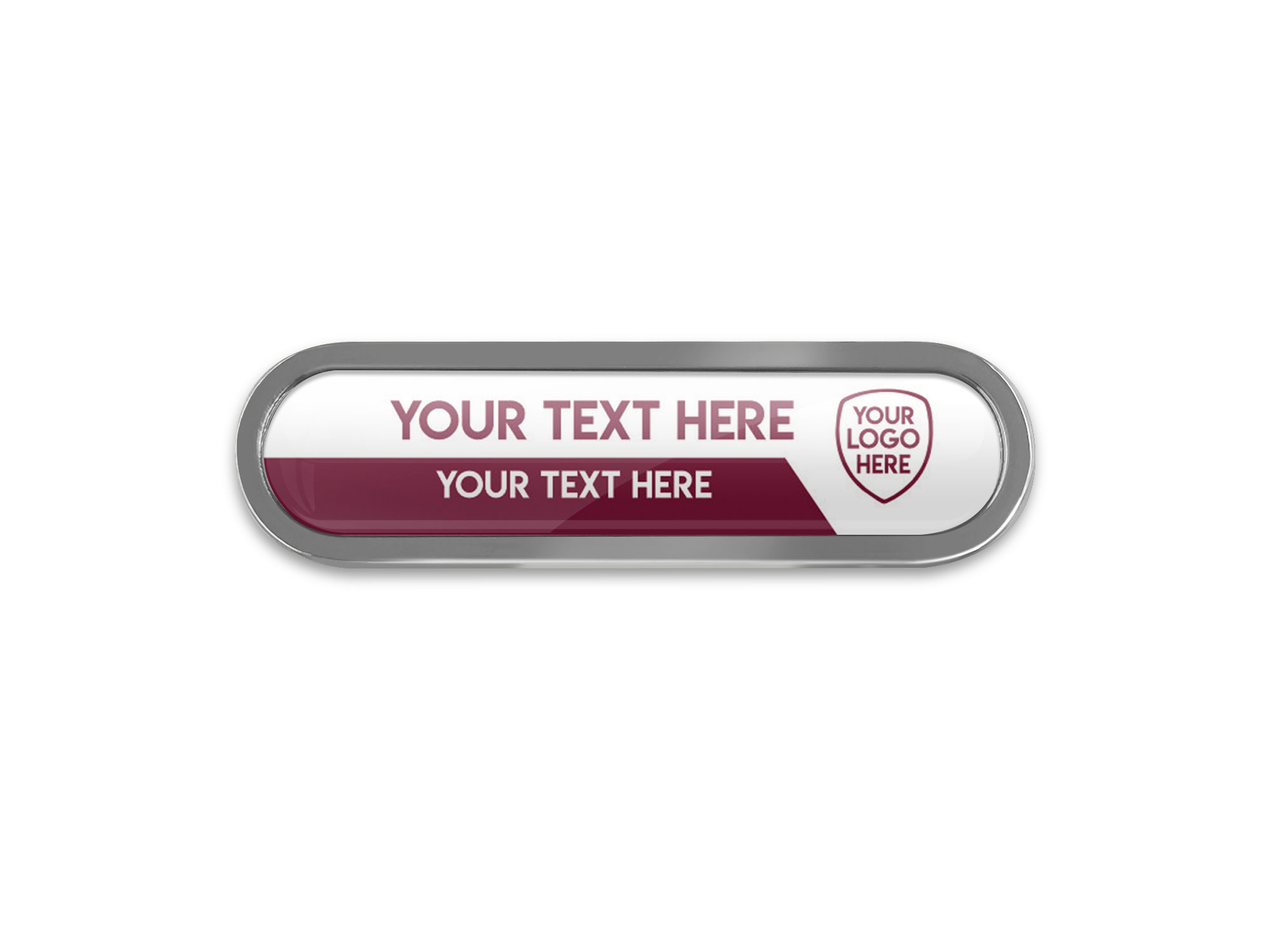 Silver Bespoke Your Logo & Text Metal Bar Badge (45mm). Made from high quality metal, this eye catching bar badge design can be used for any School appraisal purposes. No origination cost and there is only a minimum order of 10 badges required. Comes with a domed resin finish. Butterfly Pin on reverse.
