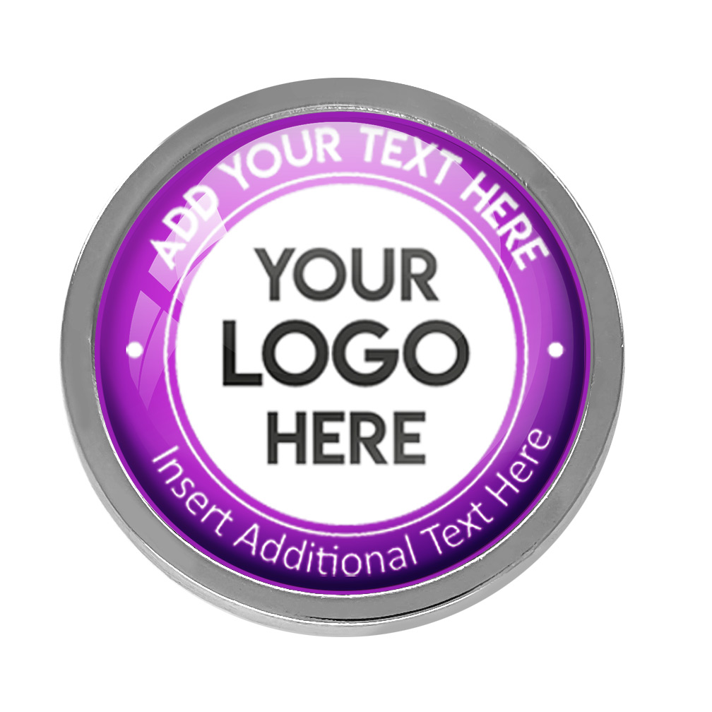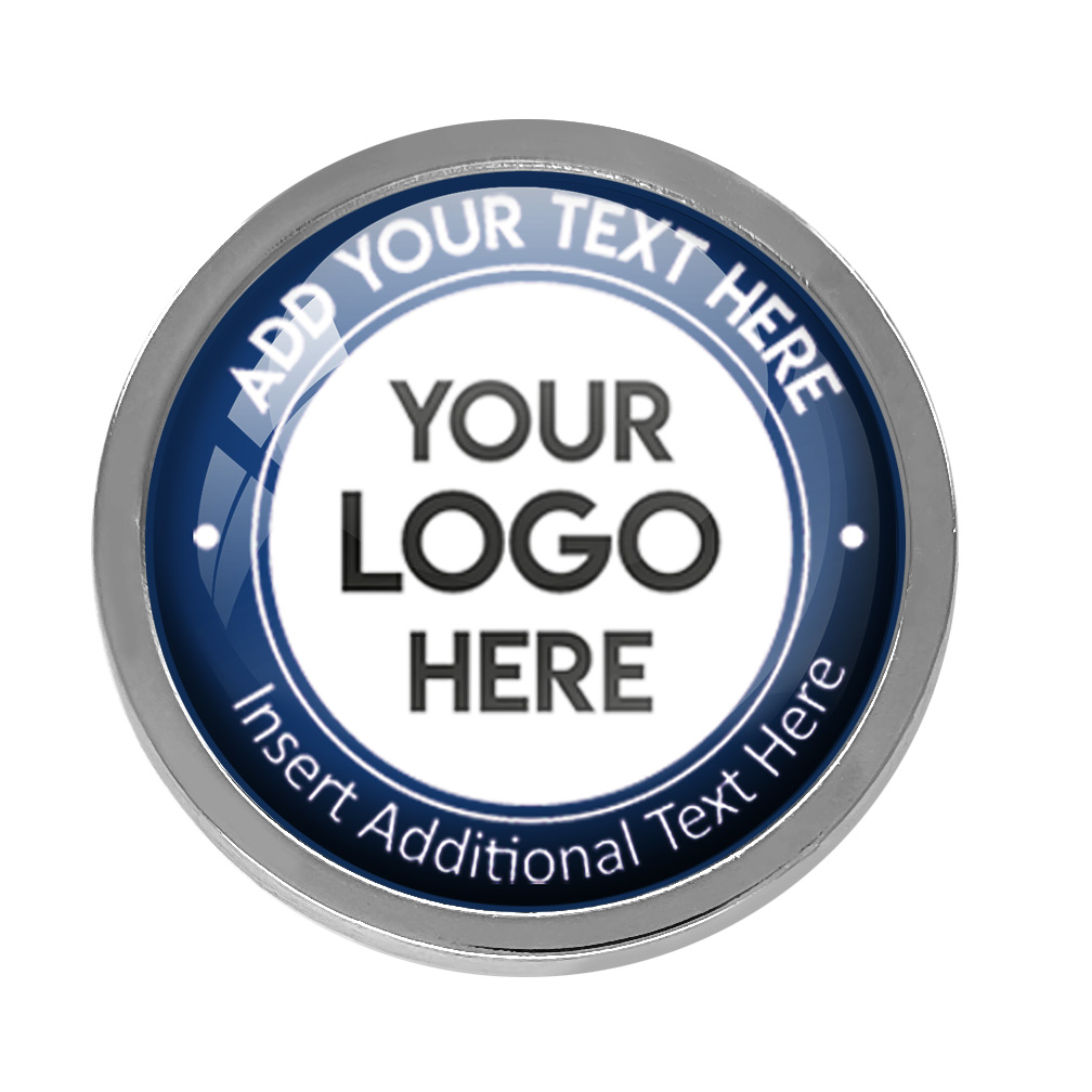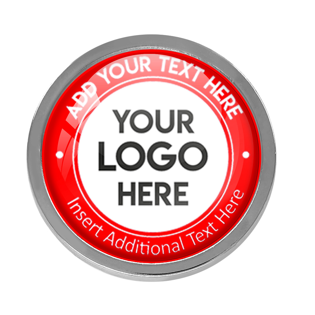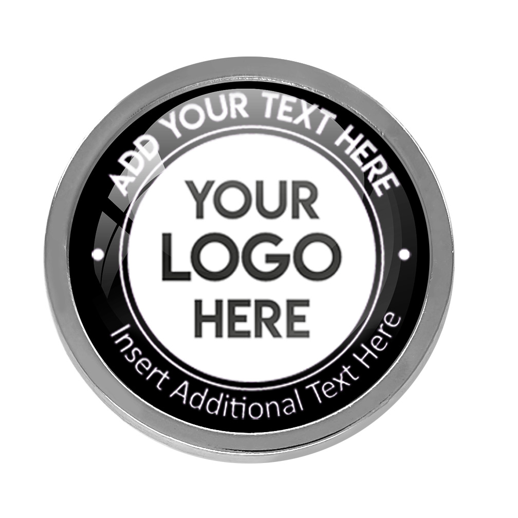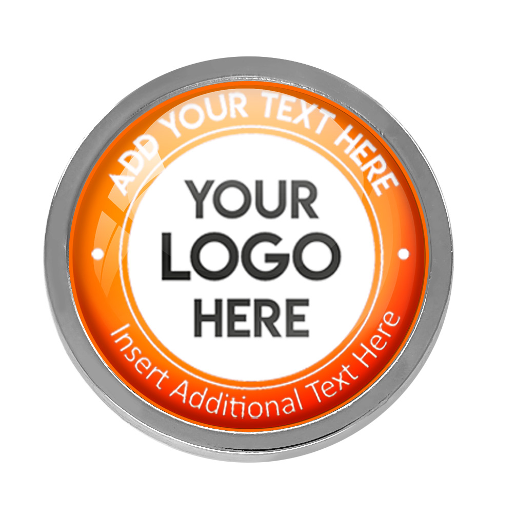 Silver Bespoke Your Logo & Text Round Metal Badge (19mm). This stand alone, high quality bespoke metal round badge, has a metal gold casing with bespoke full colour domed insert. No origination cost and there is only a minimum order of 10 badges required. Comes with a domed resin finish. Butterfly Pin on reverse.
