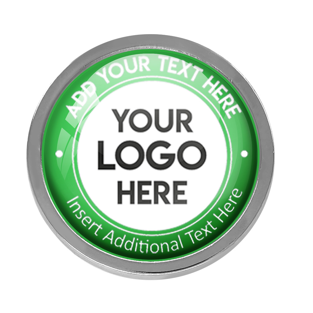 Silver Bespoke Your Logo & Text Round Metal Badge (28mm). This stand alone, high quality bespoke metal round badge, has a metal gold casing with bespoke full colour domed insert. No origination cost and there is only a minimum order of 10 badges required. Comes with a domed resin finish. Butterfly Pin on reverse.