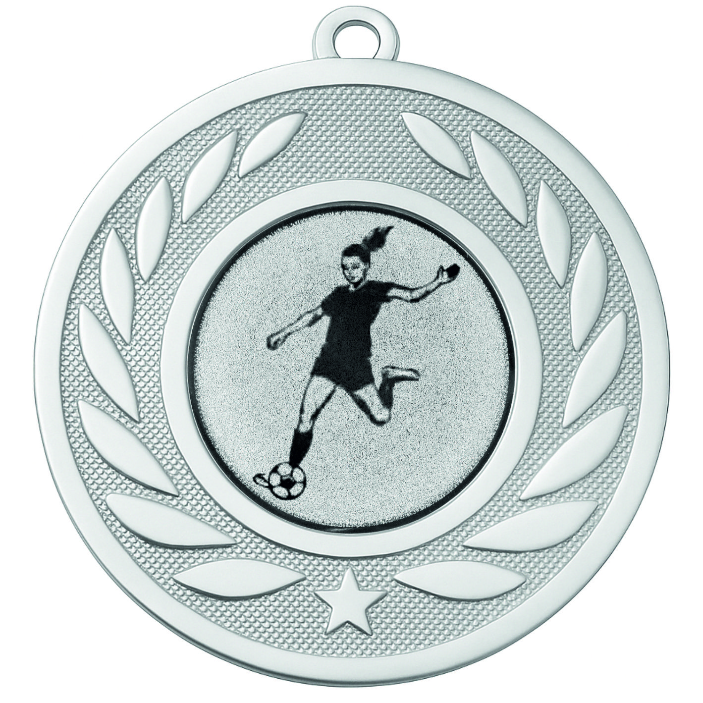 Silver Laurel Female Football Medal - FREE Ribbon - BIE.M9459.02 - This 50mm Metal cast Medal includes a free Female Football logo and free premium quality ribbon.
