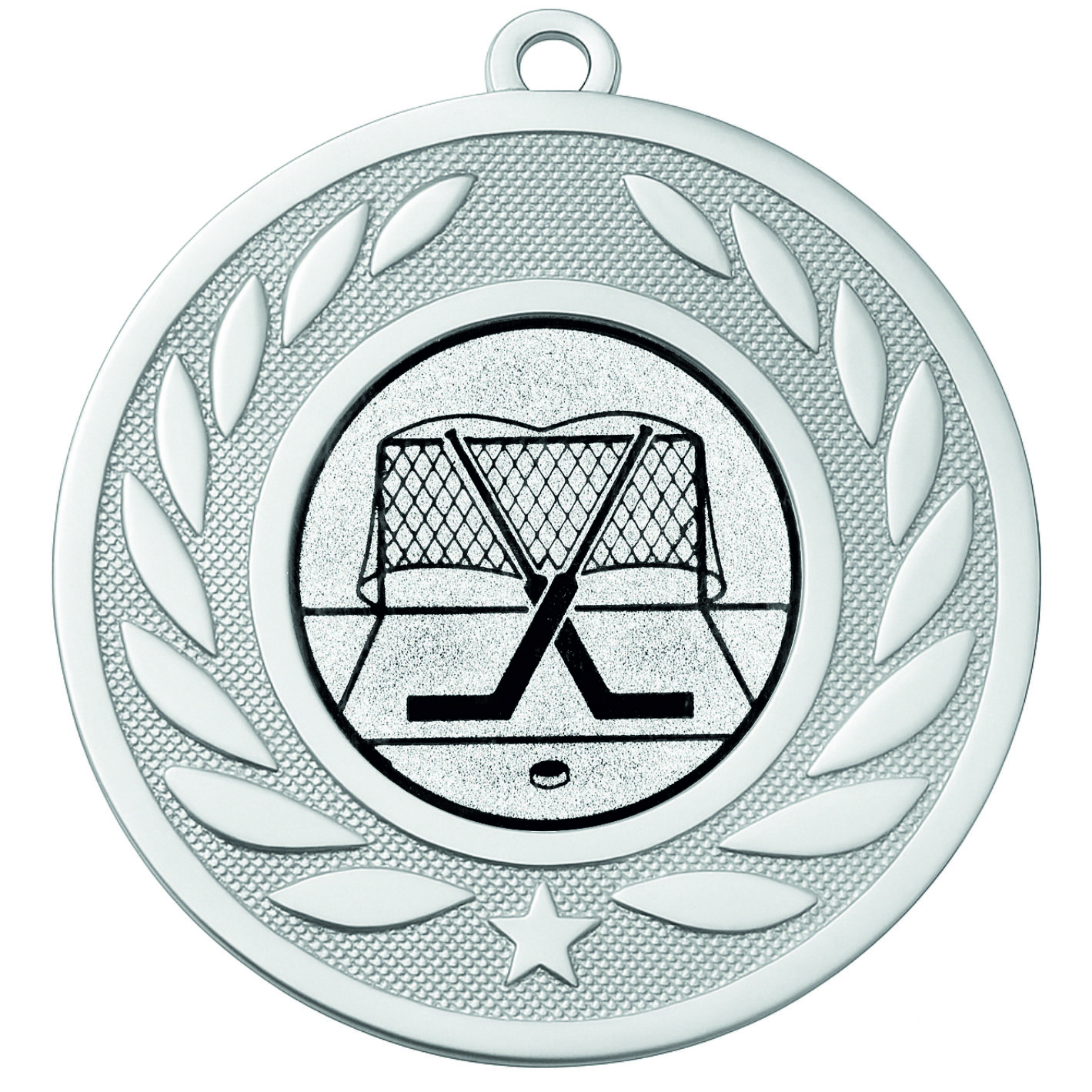 Silver Laurel Ice Hockey Medal - FREE Ribbon - BIE.M9459.02- This 50mm Metal cast Medal includes a free Ice Hockey logo and free premium quality ribbon.