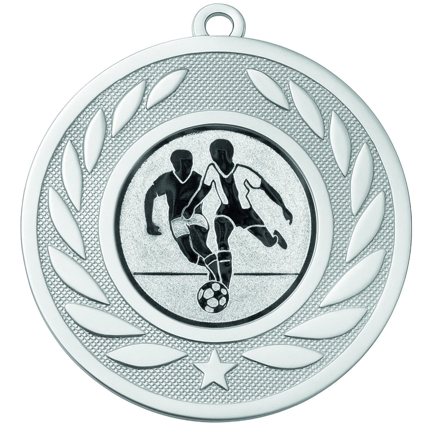 Silver Laurel Male Football Medal - FREE Ribbon - BIE.M9459.02 - This 50mm Metal cast Medal includes a free Male Football logo and free premium quality ribbon.