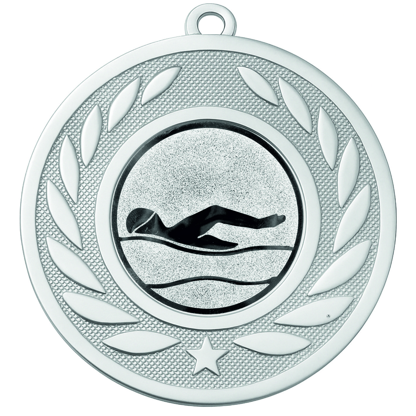 Silver Laurel Swimming Medal-FREE Ribbon-M9459.02 - This 50mm Metal cast Medal includes a free Swimming logo and free premium quality ribbon.