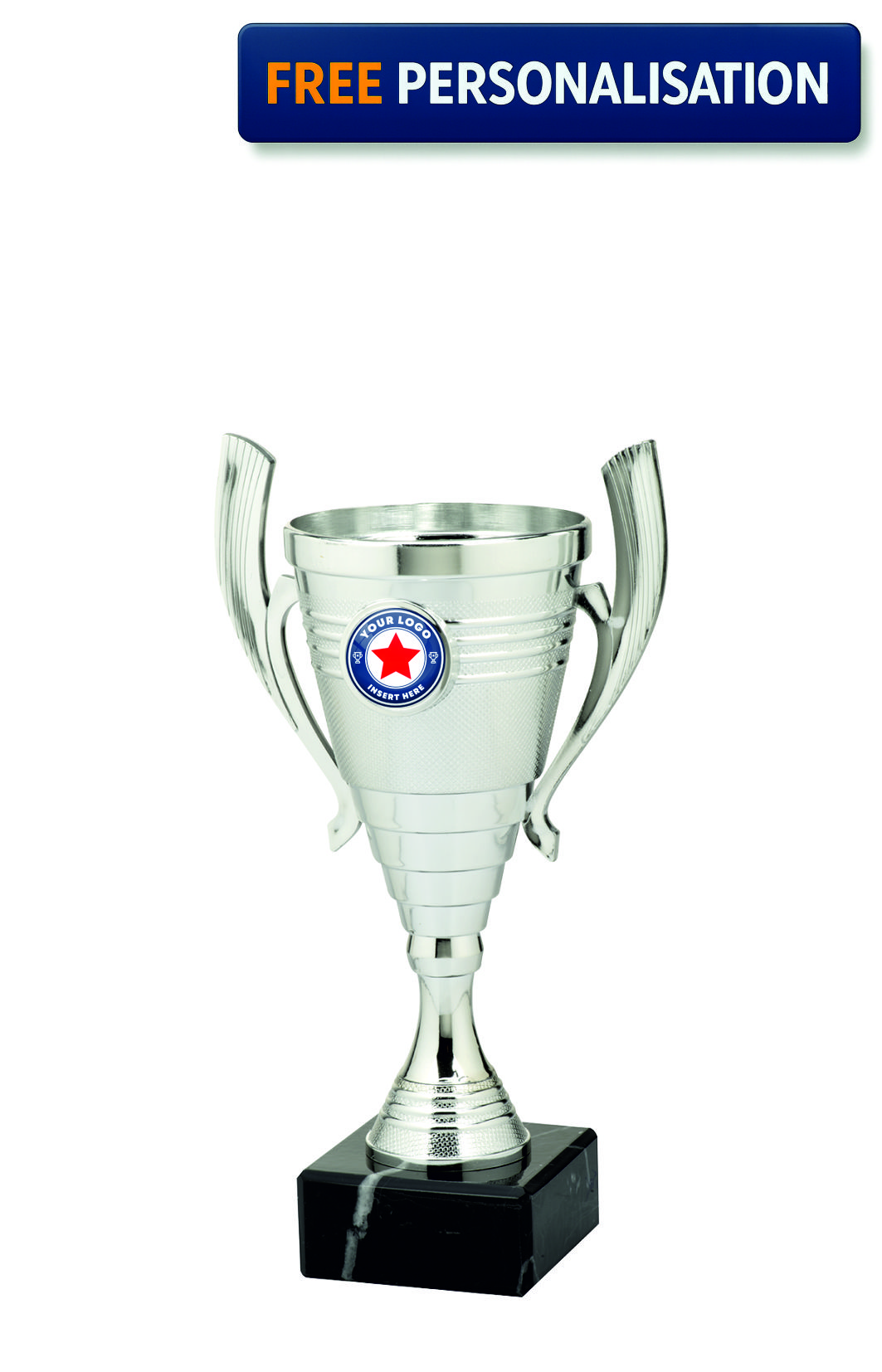Silver Mini Cup with handles - SET.356.02.A. This elegant looking cup has a unique design and is perfect for presenting at any of your upcoming Presentations. Trophy comes complete with a fully personalised engraving plate and fast delivery straight to your door.