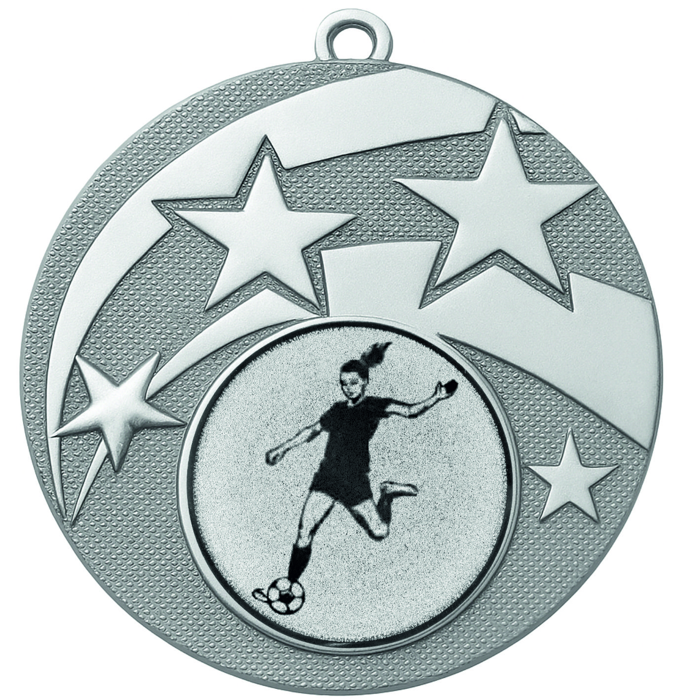 Silver Star Female Football Medal - FREE Ribbon - BIE.M9457.02 - This 50mm Metal cast Medal includes a free Female Football logo and free premium quality ribbon.
