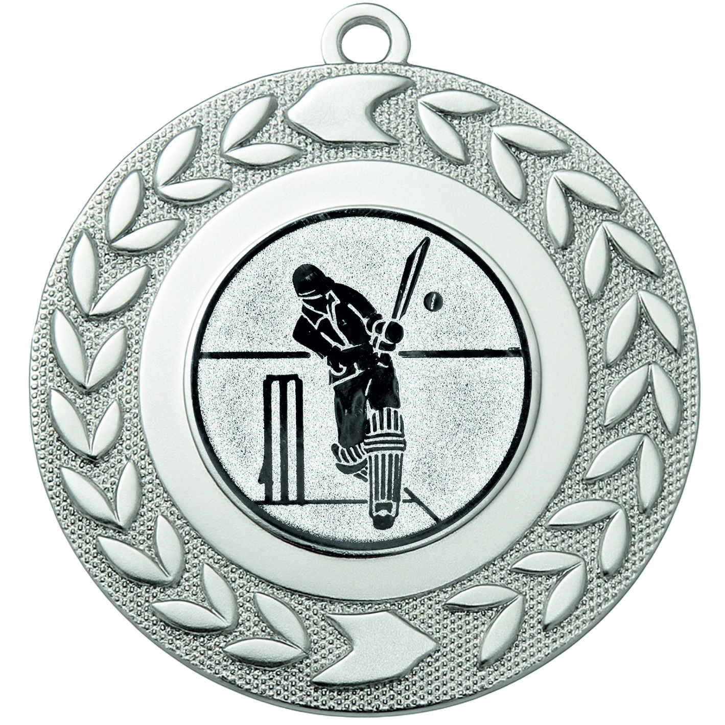 Silver Wreath Cricket Medal - FREE Ribbon - BIE.M9460.02 - This 50mm Metal cast Medal includes a free Cricket logo and free premium quality ribbon.