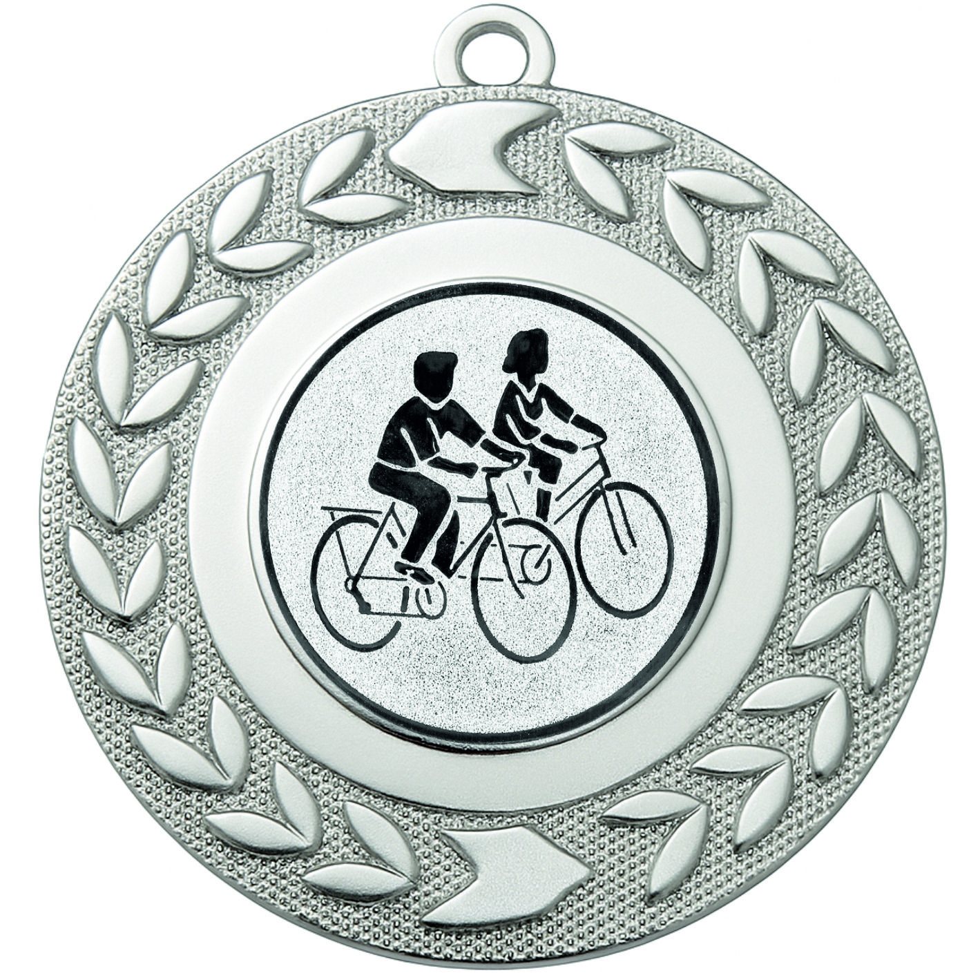 Silver Wreath Cycling Medal 2 - FREE Ribbon - BIE.M9460.02 - This 50mm Metal cast Medal includes a free Cycling logo and free premium quality ribbon.