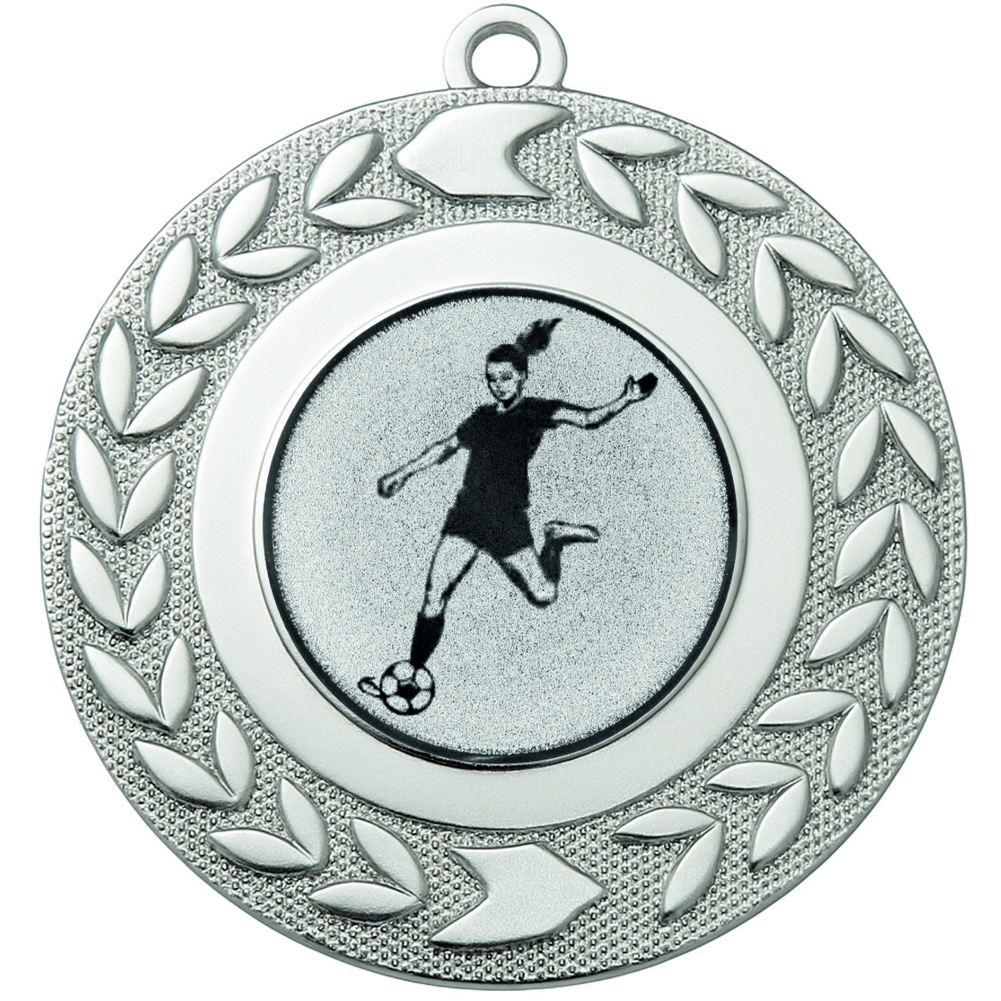 Silver Wreath Female Football Medal - FREE Ribbon - BIE.M9460.02 - This 50mm Metal cast Medal includes a free Female Football logo and free premium quality ribbon.