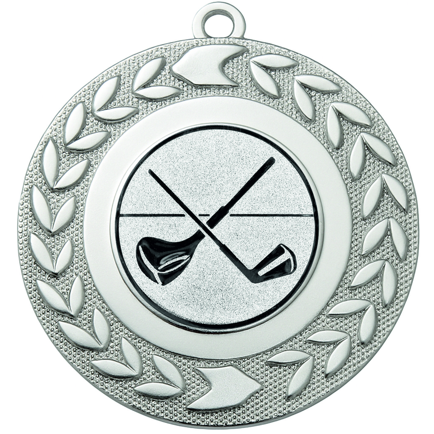 Silver Wreath Golf Clubs Medal - FREE Ribbon - BIE.M9460.02 - This 50mm Metal cast Medal includes a free Golf Clubs logo and free premium quality ribbon.