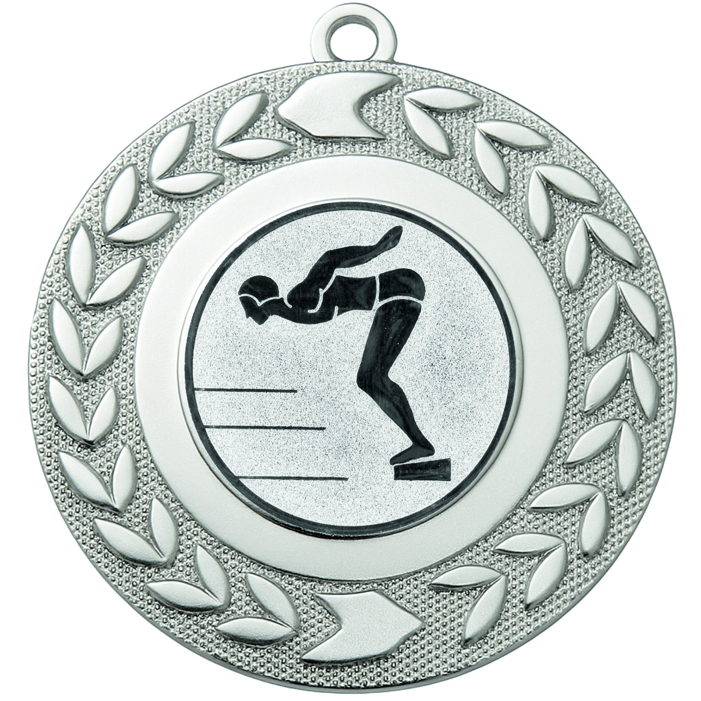 Silver Wreath Male Swimming Medal - FREE Ribbon - BIE.M9460.02 - This 50mm Metal cast Medal includes a free Male Swimming logo and free premium quality ribbon.
